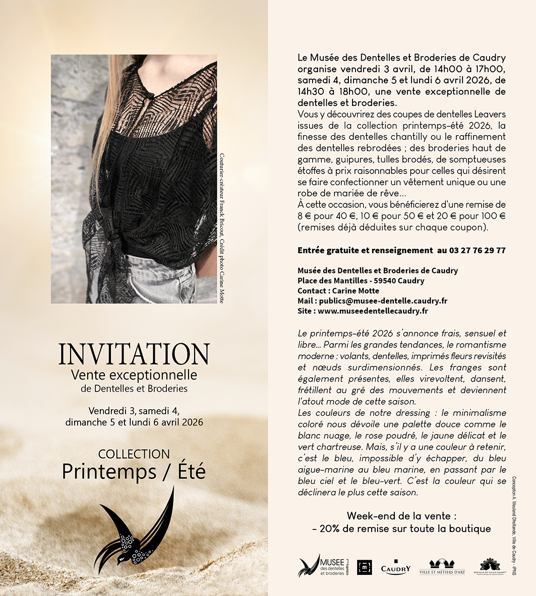 Le saviez-vous ? La Caisse régionale est partenaire du Musée des dentelles et broderies de Caudry. C’est l’adresse incontournable pour découvrir le patrimoine industriel et artistique du Nord. Pour célébrer le printemps, le musée vous invite à une vente exceptionnelle sur sa collection printemps / été.
