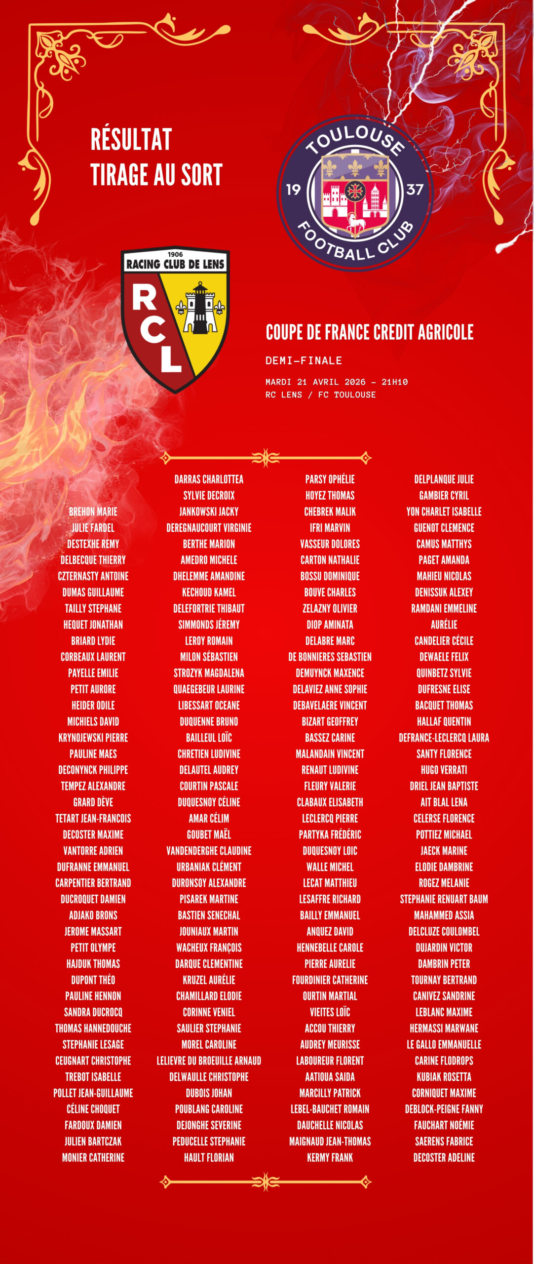 📅 Le mardi 21 avril 2026 à 21h10, le RC Lens affrontera le Toulouse FC dans une rencontre décisive, portée par la ferveur d’un stade mythique et l’enjeu d’une qualification en finale.