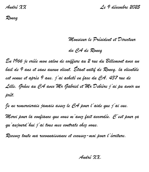 Notre campagne de communication externe consacrée au « million de clients particuliers et au million d’histoires » touche nos clients. Pour preuve l’agence de Roncq nous fait parvenir le courrier d’André, client de l’agence, à nos collègues (lettre retranscrite pour une meilleure lisibilité, tout en préservant l’anonymat de notre client) :