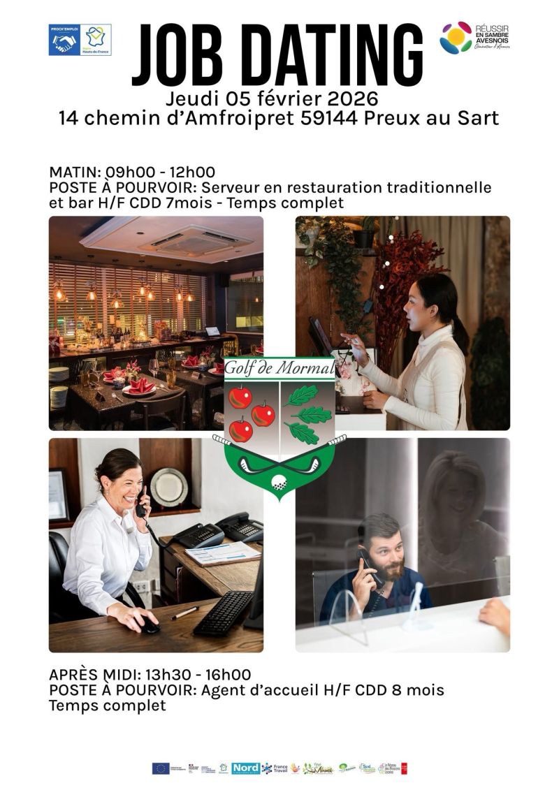Le Golf de Mormal accueille, en partenariat avec Proch’Emploi – Réussir en Sambre Avesnois, le 5 février prochain, un job dating dédié au recrutement de ses équipes. Sont à pourvoir :